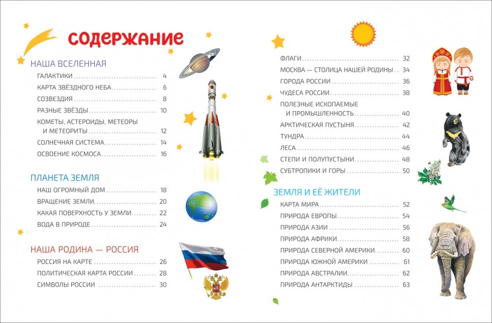 С этим атласом можно совершить невероятное путешествие по разным материкам, знакомясь с животными, обитающими на каждом из них. Но это не всё! Атлас поможет изучить звездное небо нашего полушария, узнать интересные факты о Вселенной и освоении космоса, запомнить, какая поверхность у земли, как происходит круговорот воды в природе, а также познакомит с природой России и населяющими ее народами.