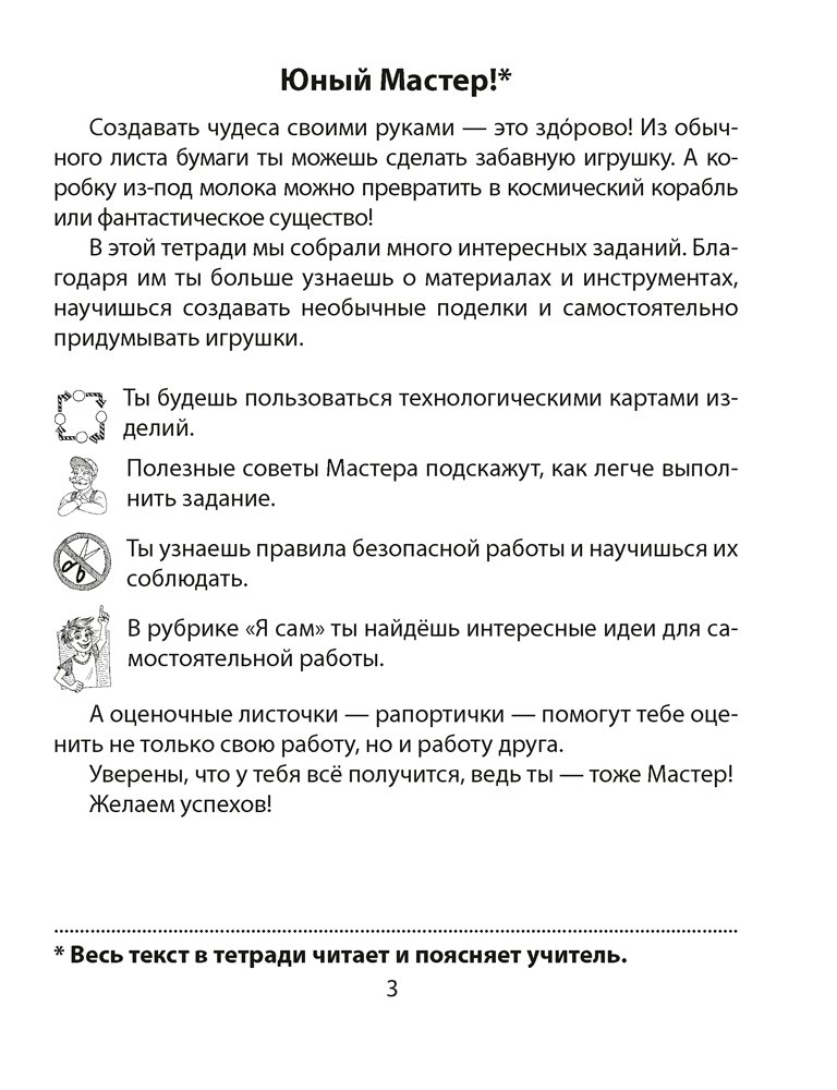 Тетрадь творческих работ содержит материалы к каждому из 34 уроков, предусмотренных учебной программой. В пособии представлены задания в игровой форме, наглядные технологические карты изделий и система самооценки, которая поможет оценить знания и умения учащихся при безотметочном обучении.