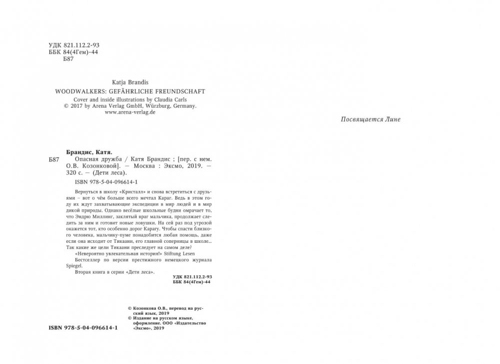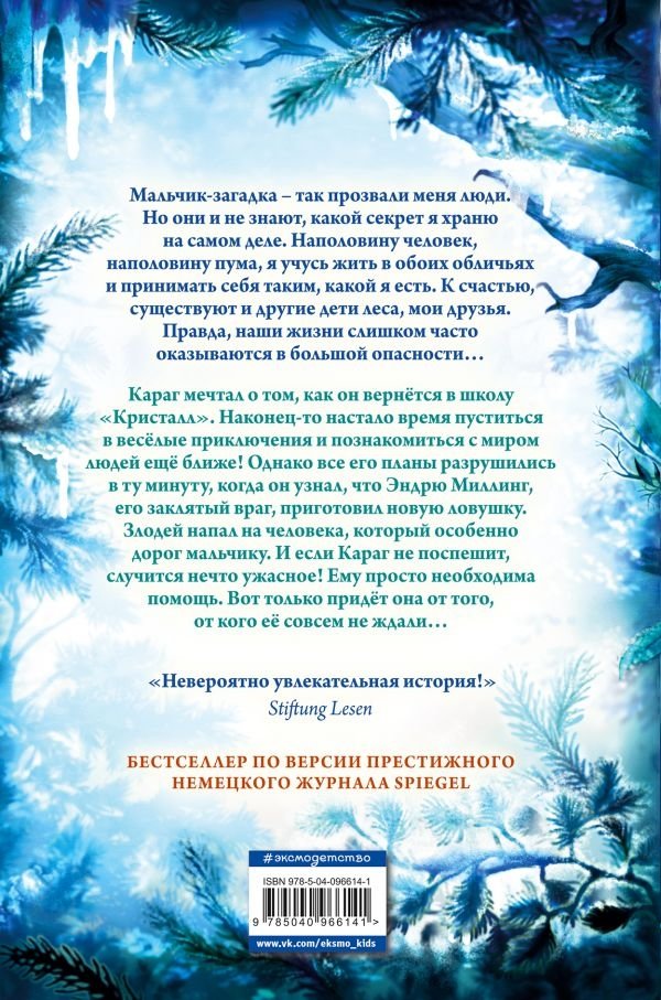 Вернуться в школу "Кристалл" и снова встретиться с друзьями – вот о чём больше всего мечтал Караг. Ведь в этом году их ждут захватывающие экспедиции в мир людей и в мир дикой природы. Однако весёлые школьные будни омрачает то, что Эндрю Миллинг, заклятый враг мальчика, продолжает следить за ним и готовит новые ловушки. На сей раз под угрозой окажется тот, кто особенно дорог Карагу. Чтобы спасти близкого человека, мальчику-пуме понадобится любая помощь, даже если она исходит от Тикаани, его главной соперницы в школе… Так какие же цели Тикаани преследует на самом деле? "Невероятно увлекательная история!" Stiftung Lesen Бестселлер по версии престижного немецкого журнала Spiegel. Вторая книга в серии "Дети леса".