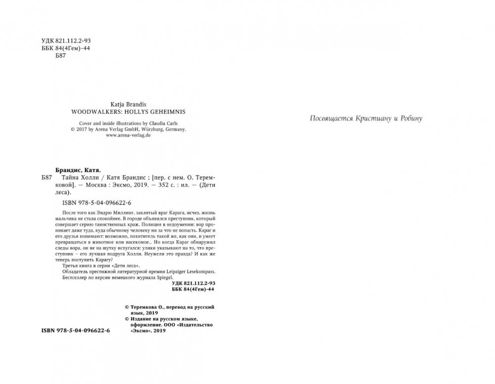 После того как Эндрю Миллинг, заклятый враг Карага, исчез, жизнь мальчика не стала спокойнее. В городе объявился преступник, который совершает серию таинственных краж. Полиция в недоумении: вор проникает даже туда, куда обычному человеку ни за что не попасть. Караг и его друзья понимают: возможно, похититель такой же, как они, и умеет превращаться в животное или насекомое… Но когда Караг обнаружил следы вора, он не на шутку испугался: улики указывают на то, что преступник – его лучшая подруга Холли. Неужели это правда? И как же теперь поступить Карагу? Третья книга в серии "Дети леса". Обладатель престижной литературной премии Leipziger Lesekompass. Бестселлер по версии немецкого журнала Spiegel.