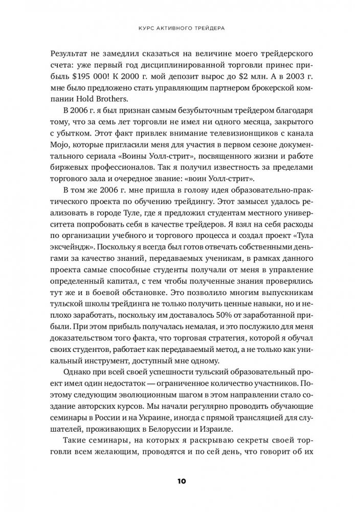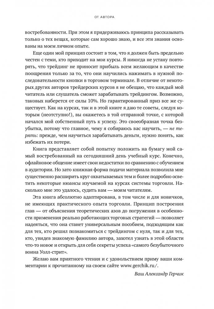 Александр Герчик — один из самых успешных трейдеров в мире. Опыт 20 лет работы автора, в течение которых 10 он закрывает с прибылью каждый месяц, стал основой его уникальной системы торговли на бирже. Книга представляет собой бумажную версию самого популярного учебного курса автора. Начиная с теоретических азов, он постепенно погружает читателя в особенности применения реально работающих торговых стратегий. Это позволяет стать книге универсальным практическим пособием, подходящим как начинающим трейдерам, так и тем, кто, увидев знакомую фамилию автора, захотел узнать в этой области что-то новое. Навыки торговли по системе Герчика проверены его учениками, большинство из которых выходят на новые масштабы трейдинга, сохраняют и увеличивают свой депозит. Читайте — и вы откроете для себя секреты успеха «самого безубыточного воина Уолл-стрит»!