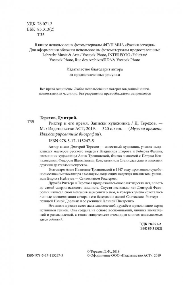 Автор книги Дмитрий Терехов — известный художник, ученик выдающихся мастеров русского модерна Владимира Егорова и Роберта Фалька, племянник художницы Анны Трояновской, близко знакомой с Петром Кончаловским, Федором Шаляпиным, Константином Станиславским и многими другими деятелями искусства. Благодаря Анне Ивановне Трояновской в 1947 году произошло судьбоносное знакомство автора с молодым, подающим надежды пианистом, учеником Генриха Нейгауза — Святославом Рихтером. Дружба Рихтера и Терехова продолжалась около пятидесяти лет, вплоть до самой смерти великого пианиста. Спустя несколько лет Дмитрий Федорович написал свои мемуары-зарисовки о нем, в которых умело сочетались личные воспоминания автора с его беседами с женой Святослава Рихтера — певицей Ниной Дорлиак и ее ученицей Галиной Писаренко. Эта книга прежде всего дань многолетней дружбе и преклонение перед истинным гением. Она создана на основе воспоминаний, личных впечатлений и размышлений, а также свидетельств очевидцев многих описываемых здесь событий.
