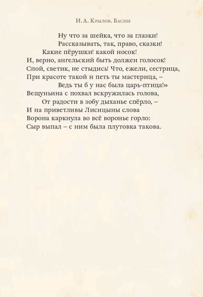 С баснями Ивана Андреевича Крылова многие знакомятся ещё в детстве и возвращаются к ним во взрослом возрасте, перечитывая и открывая новые смыслы. Их аллегоричность и поэтичность понятны и ребёнку и взрослому. Удивительные по красоте и тонкому юмору, несущие в себе народную мудрость, они были переведены на разные европейские языки.