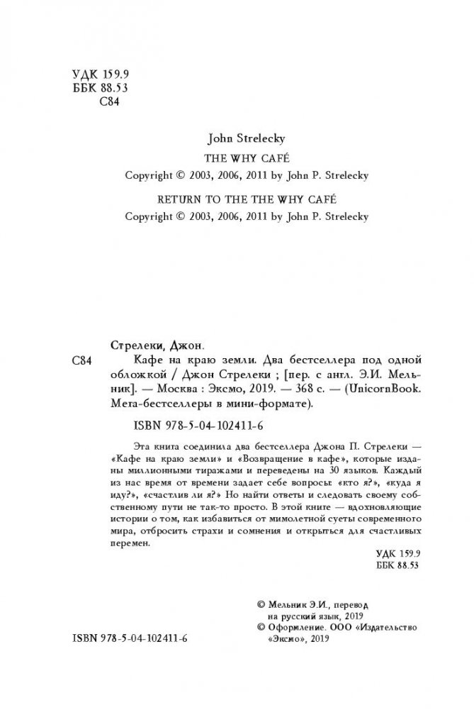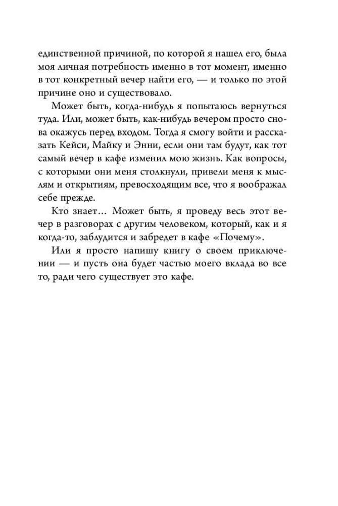 После долгого блуждания в темноте и неизвестности все, что вам нужно — зайти в уютное кафе, выбрать столик и раскрыть меню. Вместе с главным героем Джоном вы пройдете короткий, но полный удивительных открытий путь — путь к самому себе. Каждому из нас необходимо хоть раз остановиться посреди суеты и тревог современного мира и ответить на главный вопрос: «Почему я здесь?». Понять, что действительно значимо, увидеть цель своей жизни в дымке будущего и двигаться к ней, каждый день ощущая себя счастливым. Эта книга — мировой бестселлер, переведенный на 30 языков — вдохновит вас на перемены, о которых сегодня вы можете только мечтать.