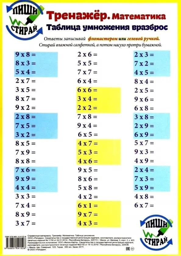 На двусторонней ламинированной карточке формата А4 приведены таблицы умножения, в том числе в разброс. Так ребенок может выучить важные математические примеры и проверить свои знания. Ламинированную табличку удобно всегда носить с собой и при необходимости обратиться к ней за помощью.