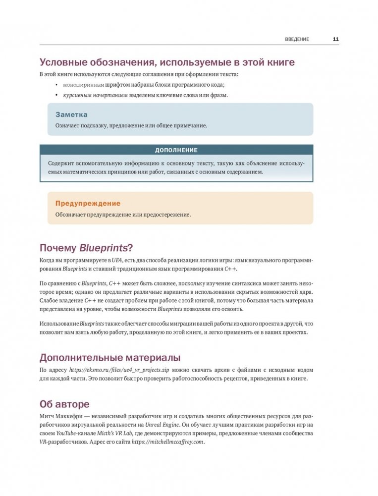 Известный VR-разработчик Митч Маккефри собрал вместе лучшие практики, общие парадигмы взаимодействия и руководства по реализации этих парадигм в Unreal Engine, и практические советы по выбору решений, максимально подходящих для ваших проектов. “Рецепты” Митча представляют собой пошаговые инструкции и расширяют ваше понимания теории и математики.