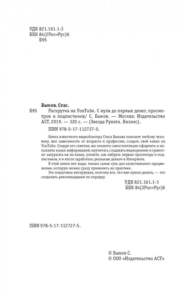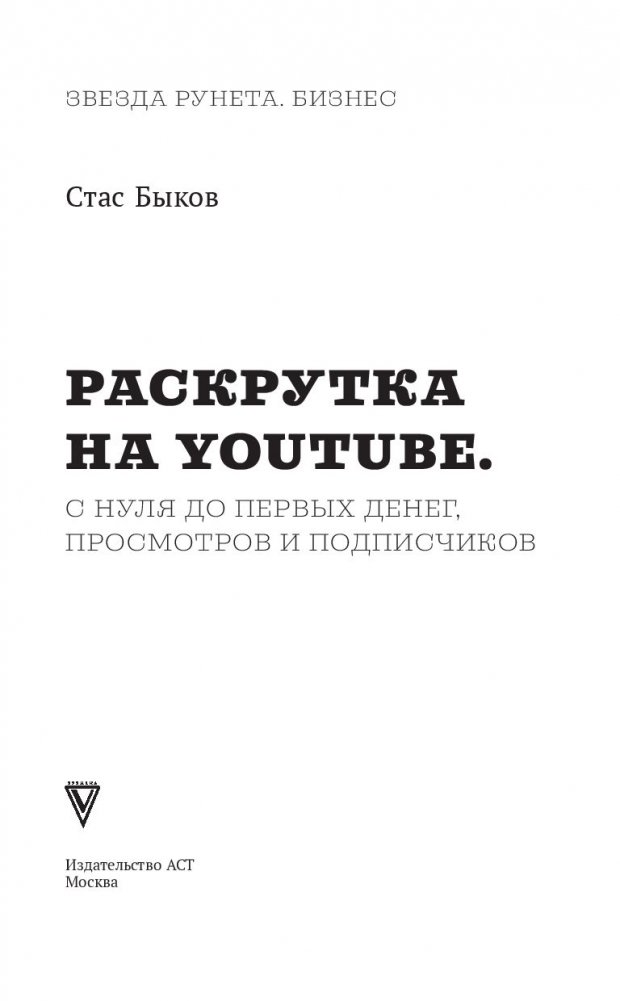Книга известного видеоблогера Стаса Быкова поможет любому человеку, вне зависимости от возраста и профессии, создать свой канал на YouTube. Следуя его советам, вы сможете самостоятельно оформить и наполнить канал информацией, научитесь создавать видеоролики и грамотно загружать их на канал, узнаете, как набрать первые просмотры и подписчиков, и в итоге заработать реальные деньги в Интернете.