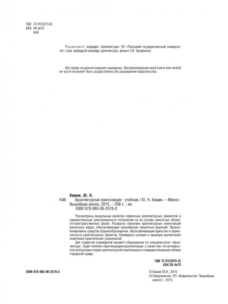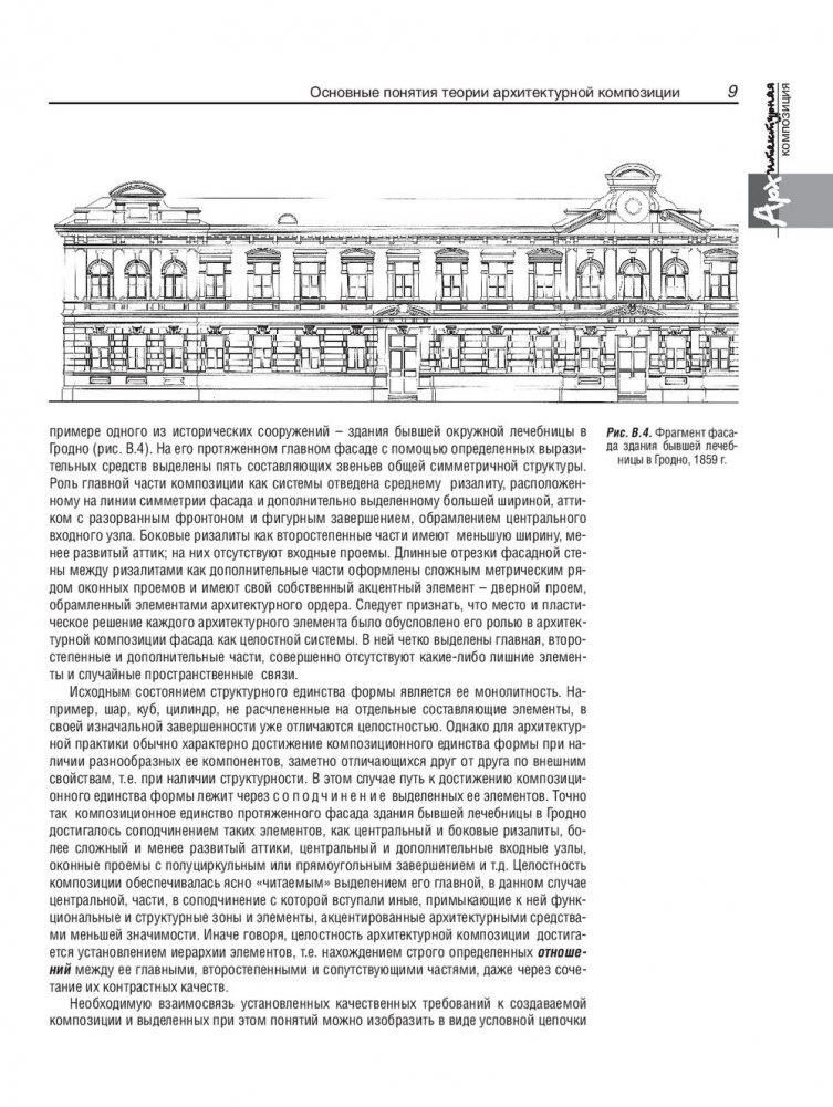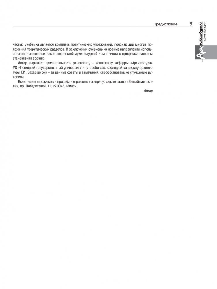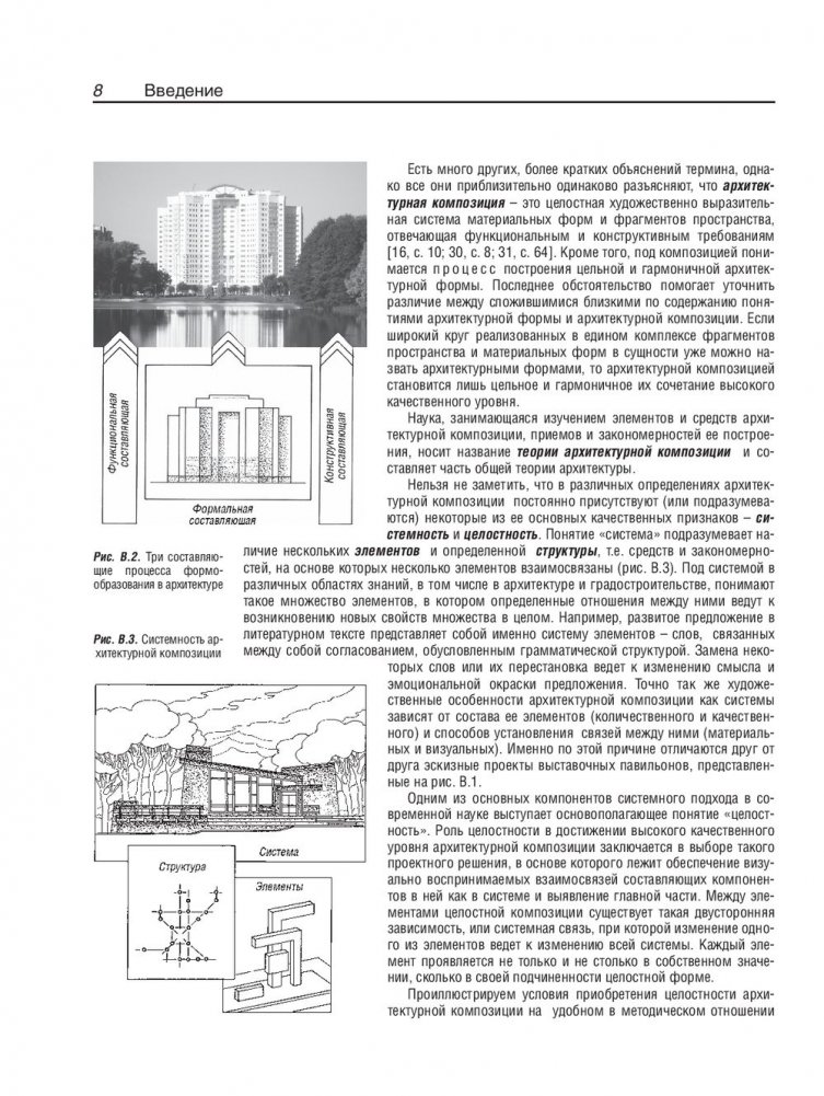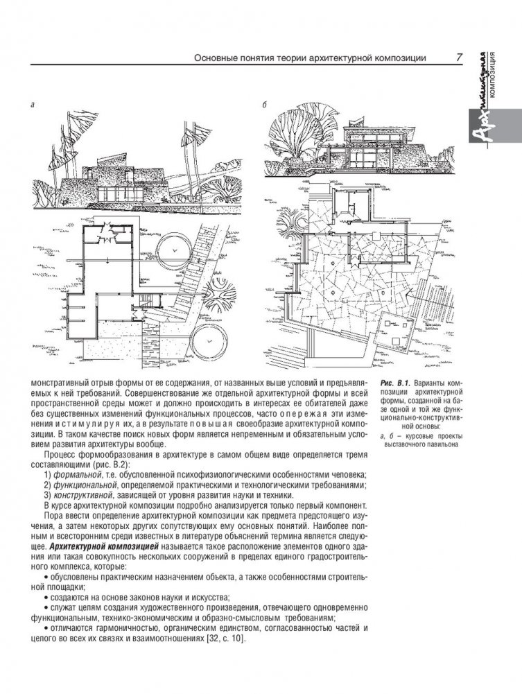Рассмотрены визуальные свойства архитектурных элементов и художественные закономерности построения на их основе целостных объемно-пространственных форм. Раскрыты признаки архитектурных композиций различных видов, обусловливающие единство и гармоничность архитектурных объектов. Приведены условия и примеры выполнения комплекса практических упражнений.