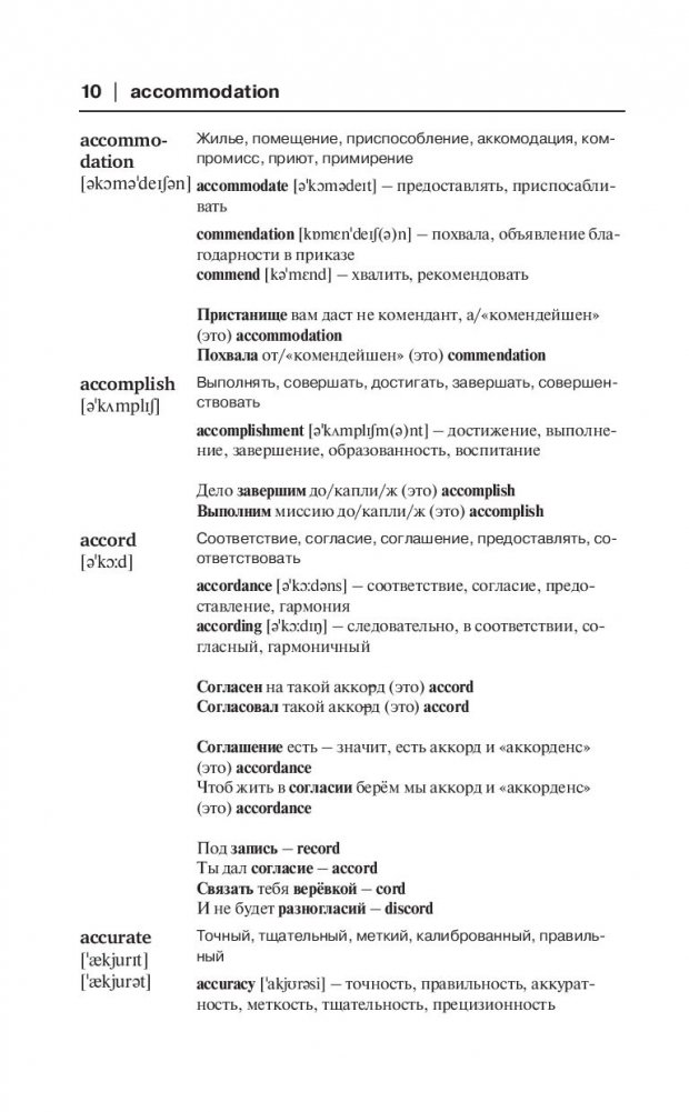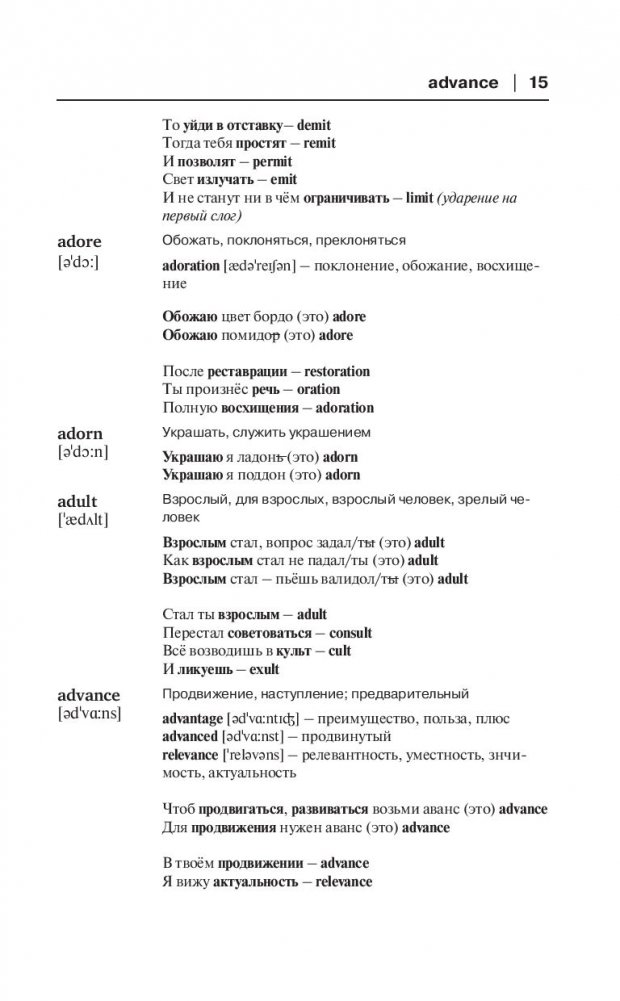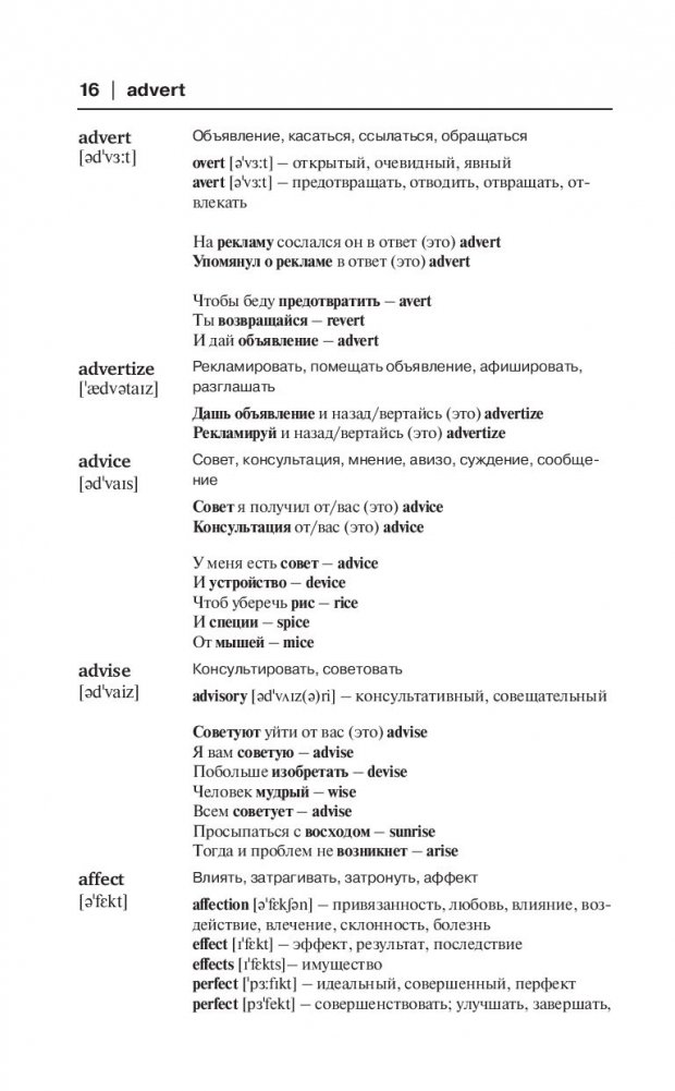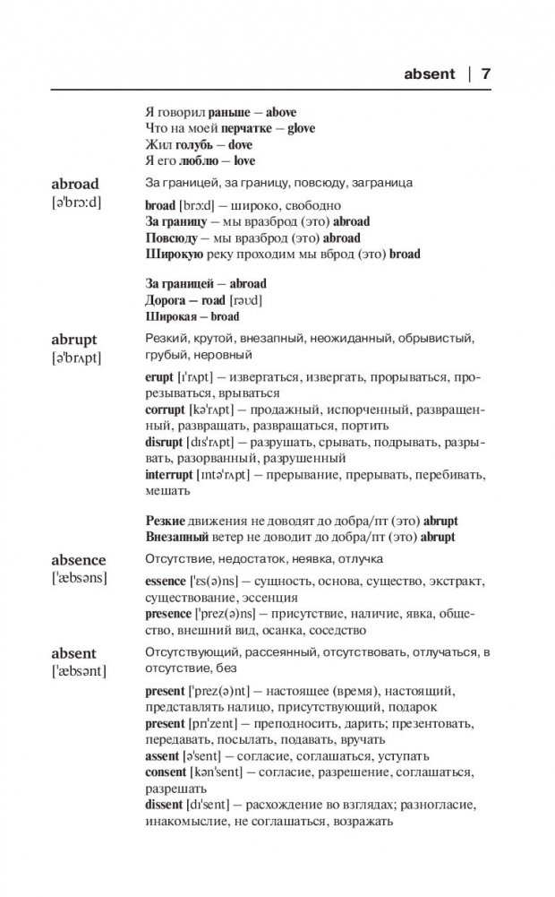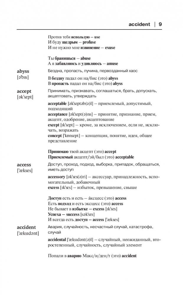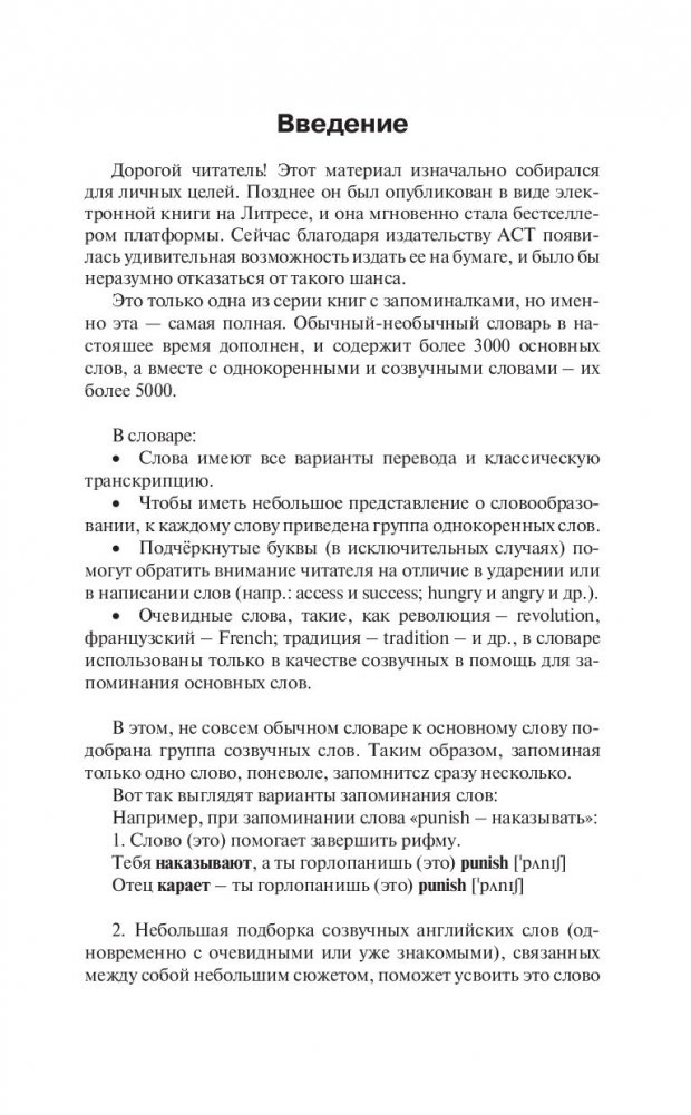 Данный англо-русский словарь содержит более 3000 слов с транскрипцией. Помимо перевода на русский язык словарная статья содержит также рифмовки и подборки созвучных слов. Такая мнемотехника помогает читателю запомнить новые английские слова всего за пару прочтений. Это первое печатное издание известной книги, ставшей бестселлером Литреса за считанные дни после публикации на платформе.