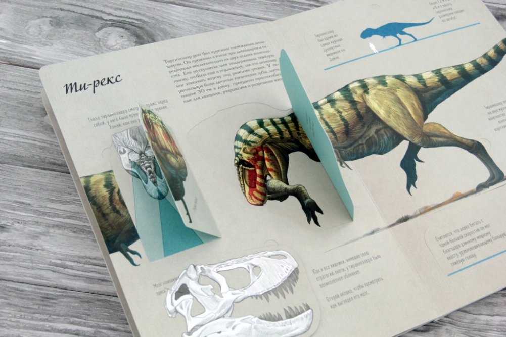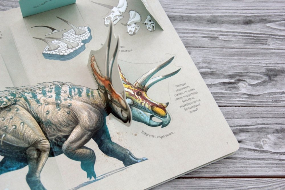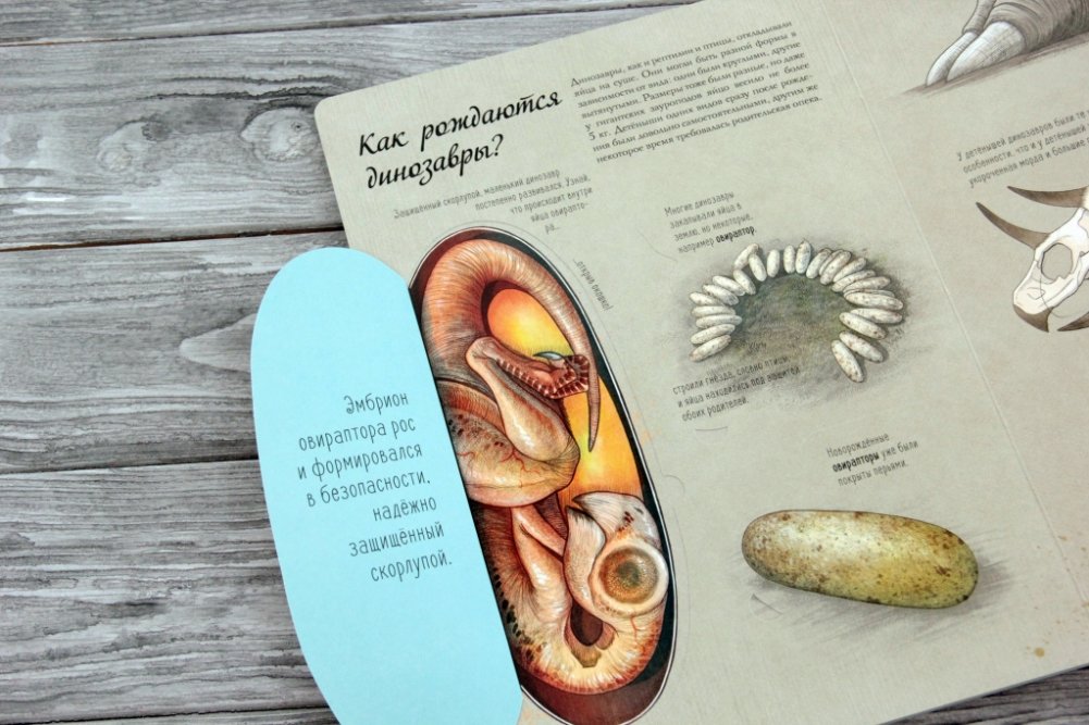 Каждый иллюстрированный разворот содержит увлекательную информацию, а также окошки, открыв которые ребёнок сможет изучить понравившегося динозавра подробнее.