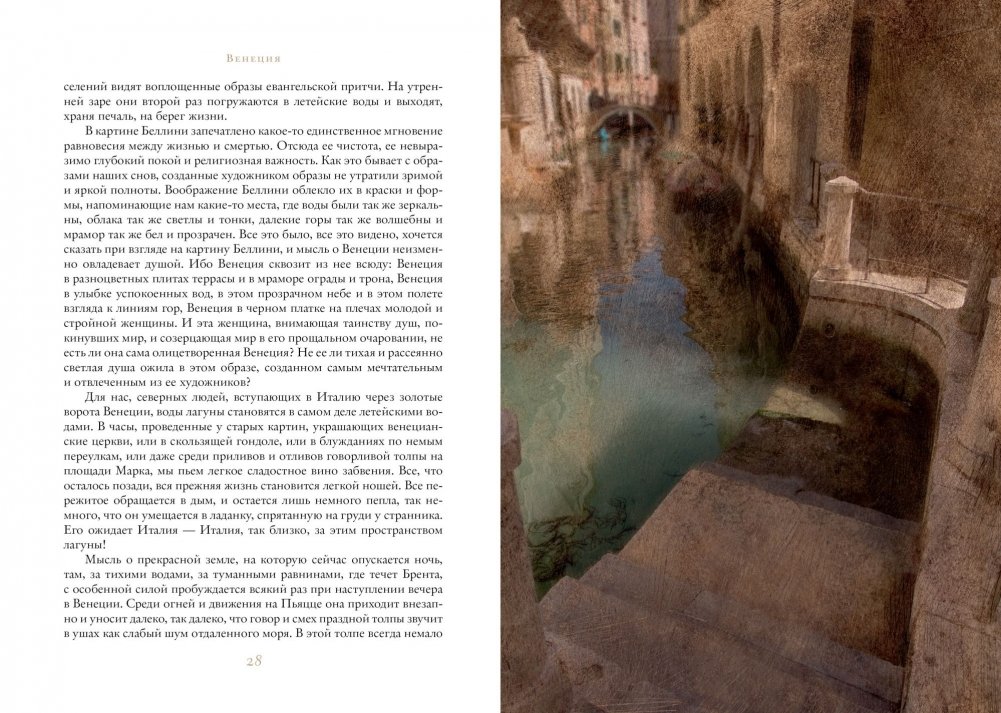Изобразительный ряд в настоящем издании составляют произведения петербургского художника Нади Кузнецовой, работающей на стыке двух техник – фотографии и графики. В нее работах замечательно переданы тот особый свет, «итальянская пыль», которой по сей день напоен воздух страны, которая была для Павла Муратова духовной родиной.