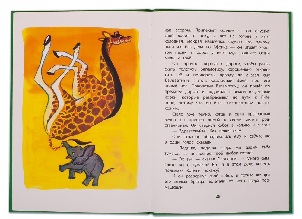 В книгу вошли две сказки Р. Киплинга — «Отчего у Верблюда горб» и «Слонёнок». На русский язык сказки перевёл К.И. Чуковский, а стихотворные тексты даны в переводе С.Я. Маршака.