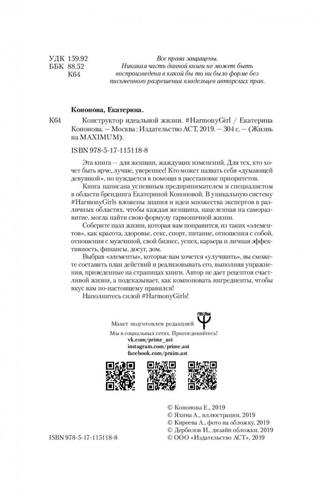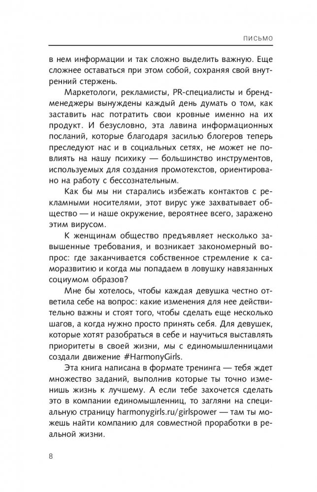 Книга написана успешным предпринимателем и специалистом в области брендинга Екатериной Кононовой. В уникальную систему #HarmonyGirls вложены знания и идеи множества экспертов в различных областях, чтобы каждая женщина, нацеленная на саморазвитие, могла найти свою формулу гармоничной жизни.