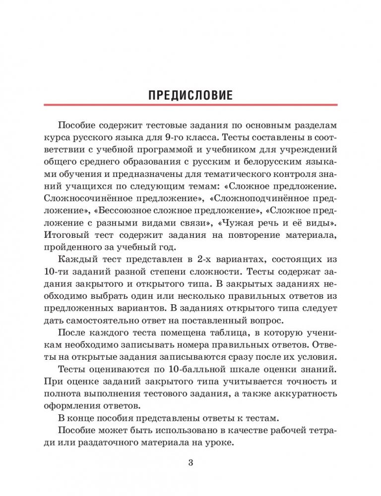 Пособие представляет собой сборник тестовых заданий по основным разделам курса русского языка, изучаемого в 9 классе. Тесты составлены в соответствии с учебной программой и учебником для учреждений общего среднего образования. Итоговый тест содержит задания на повторение материала, пройденного за весь учебный год.