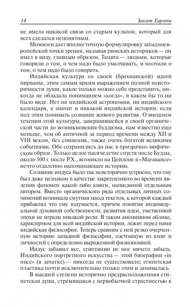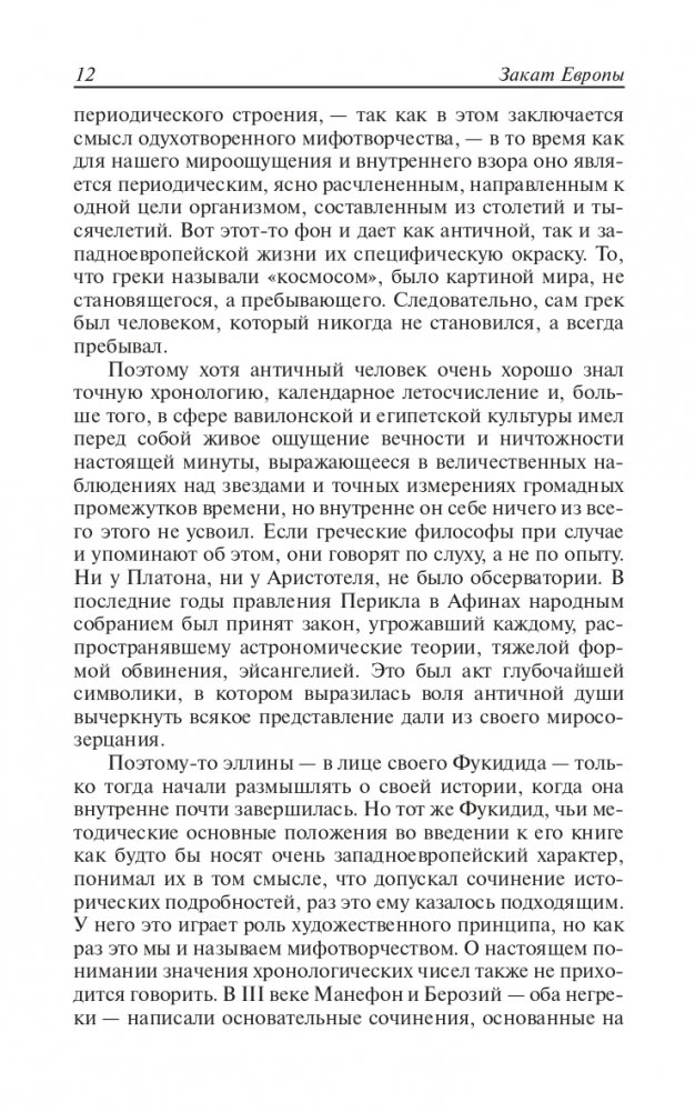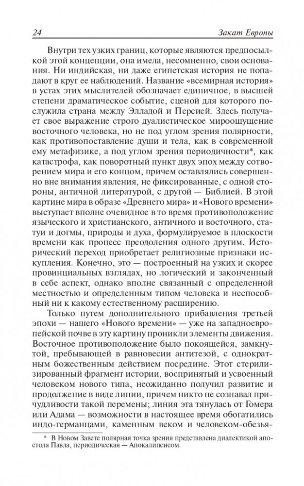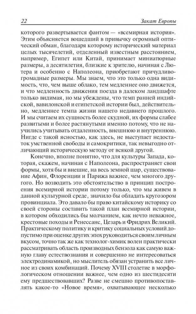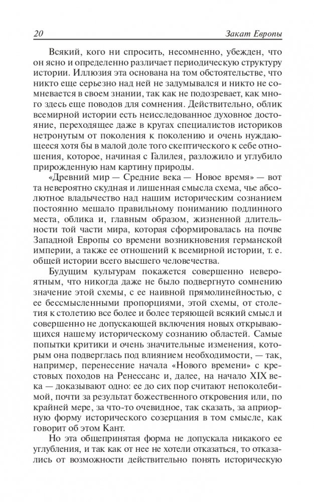 Это главное сочинение немецкого философа и историка Освальда Шпенглера (1880—1936) появилось в 1918—1922 гг. На русском языке долгое время не переиздавалось, поскольку считалось написанным под влиянием сугубо реакционных идей Ф. Ницше. Автор в рамках своей концепции определенного жизненного цикла любой культуры говорил о неизбежной, по его мнению, дегуманизации европейской культуры, о растущем господстве техницизма, «перерождающем ее в цивилизацию» с заменой творчества и развития бесплодием и окостенением.
