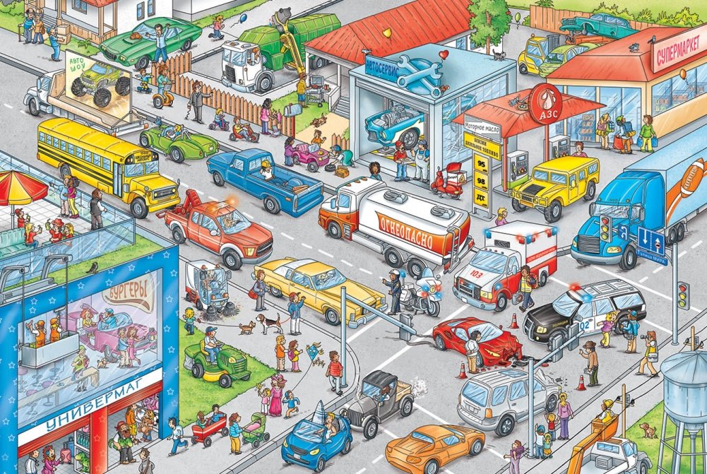 «Кругом машины» – невероятно насыщенный сюжетами и деталями виммельбух, в центре внимания которого легковые и гоночные автомашины, грузовики и фуры, автобусы и поезда, разнообразный спецтранспорт, тракторы, самолеты, вертолеты, катера и великое множество других машин и механизмов, которые ездят, летают и плавают.