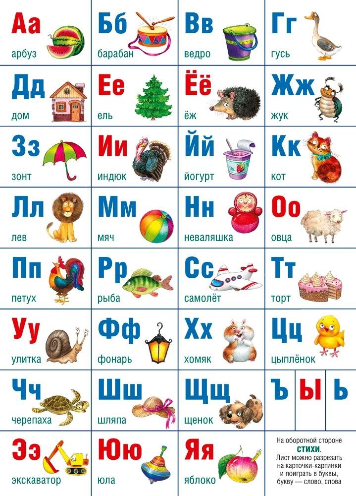 Лист можно разрезать на отдельные карточки и провести игровое (индивидуальное или групповое) занятие с детьми. Можно выучить стихи, легко запомнить буквы, играть с карточками.
