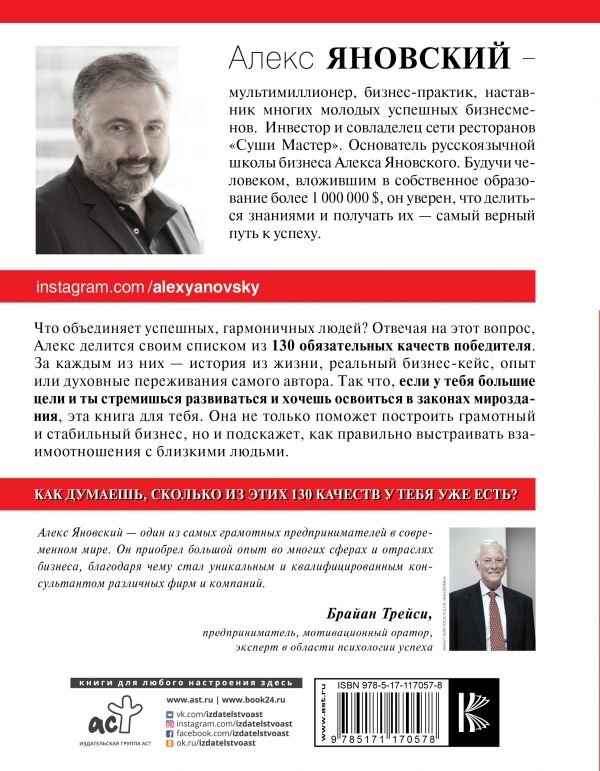 Что объединяет успешных, гармоничных людей? Отвечая на этот вопрос, Алекс делится своим списком из 130 обязательных качеств победителя. За каждым из них — история из жизни, реальный бизнес-кейс, опыт или духовные переживания самого автора. Так что, если у тебя большие цели и ты стремишься развиваться и хочешь освоиться в законах мироздания, эта книга для тебя. Она не только поможет построить грамотный и стабильный бизнес, но и подскажет, как правильно выстраивать взаимоотношения с близкими людьми.