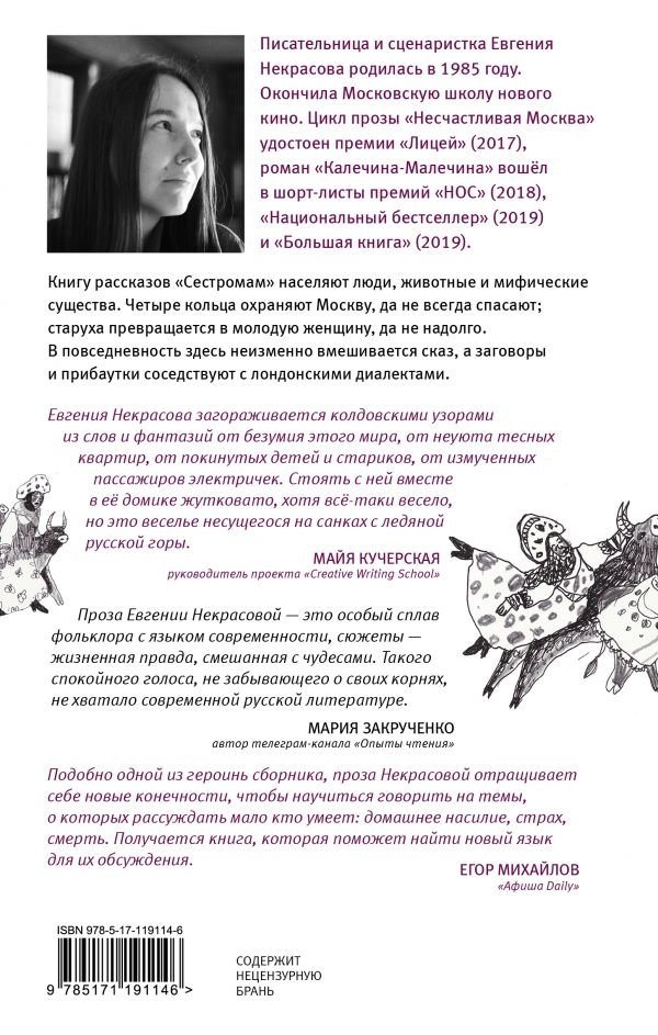 Книгу рассказов «Сестромам» населяют люди, животные и мифические существа. Четыре кольца охраняют Москву, да не всегда спасают; старуха превращается в молодую женщину, да не надолго.