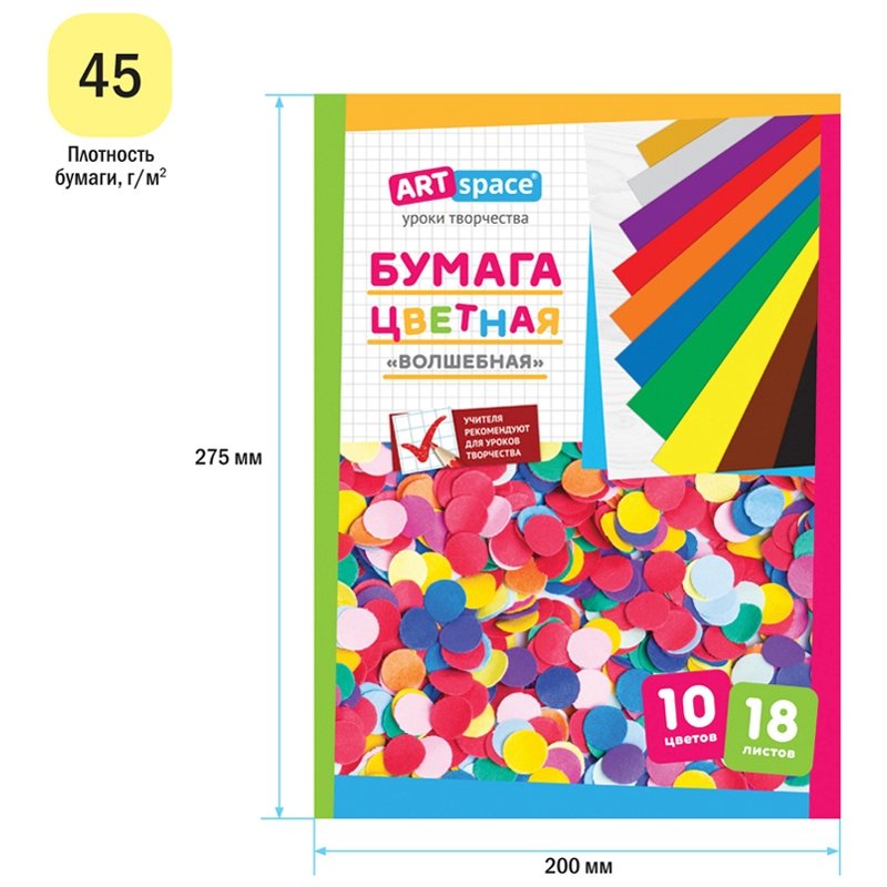 Цветная бумага - замечательный инструмент для творчества. В набор входят 18 листов из 10 различных цветов, в том числе два листа серебристого и золотого цветов. Блок - газетная и мелованная бумага, обложка - офсетная бумага. Формат А4.