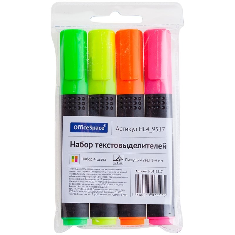 Набор текстовыделителей предназначен для выделения текста на всех типах бумаги. Толщина линии 1-4 мм. Флуоресцентные чернила на водной основе. Набор упакован в ПВХ чехол. В наборе 4 цвета: зеленый, розовый, оранжевый, желтый. Хранить с закрытым колпачком.