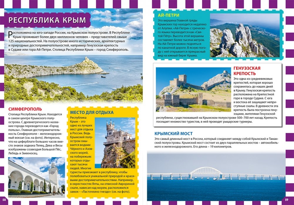 Из этой красочной энциклопедии ты узнаешь, кто основал Санкт-Петербург, город дворцов и мостов, сколько народов живёт в России, чем знаменита Камчатка, где проходит граница между Европой и Азией, как попасть в музей Солнца и многое другое...