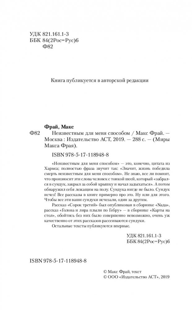 «Неизвестным для меня способом» — это, конечно, цитата из Хармса; полностью фраза звучит так: «Значит, жизнь победила смерть неизвестным для меня способом». Не знаю, все ли помнят, что произносит эти слова человек с тонкой шеей, который «забрался в сундук, закрыл за собой крышку и начал задыхаться». А потом обнаружил себя лежащим на полу. Сундука нигде не было. Сундук исчез! Все рассказы в книге примерно про это. Ну или для этого. Чтобы все эти ваши сундуки исчезали, один за другим. Рассказ «Сорок третий» был опубликован в сборнике «Nада», рассказ «Голова и лира плыли по Гебру» — в сборнике «Карты на стол», обойтись без них было совершенно невозможно, очень уж качественно от этих рассказов рассеиваются сундуки. Остальные тексты публикуются впервые.