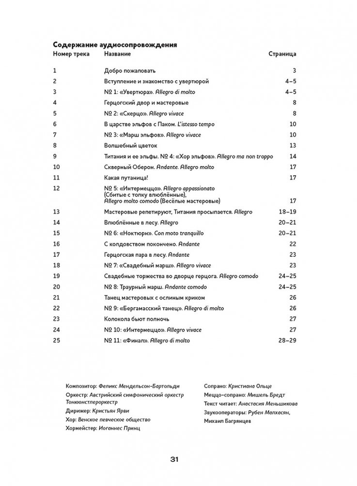 В этой книге юных читателей ждёт весёлая и увлекательная история о ночных приключениях знатных молодых людей, а также эльфов и простаков-мастеровых. Все они – герои сказочной комедии Уильяма Шекспира, написанной в 1594–1596 годах. Концертная увертюра Феликса Мендельсона, созданная для постановки этой комедии при дворе короля Фридриха-Вильгельма IV, перенесёт детей и их родителей в леса под Афинами, где проказливые эльфы с помощью волшебных чар запутывают влюблённых молодых людей и дурачат недотёп-ремесленников, отправившихся в лес репетировать.