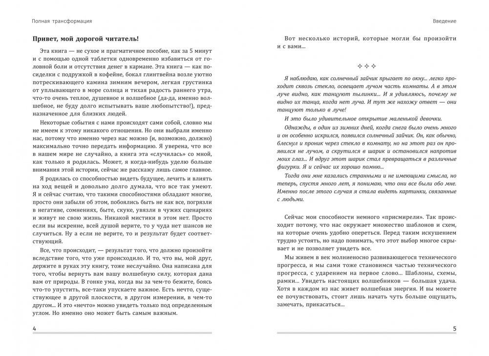 Все, что с нами происходит, — это отражение того, что есть у нас внутри. Если мы себе нравимся, то притягиваем события, которые нам приятны. Если что-то мы в себе не любим, то именно в этой области с нами начинают происходить неудачи. И именно поэтому так важно начать менять не внешнее, а работать с внутренними процессами. Хотите узнать, как менять этот образ будущего? Все просто — через перемены настоящего! В книге собраны лучшие трансформационные техники, которые дают прекрасные результаты. Книга приглашает вас совершить удивительное путешествие к самому себе, она поможет вам вернуть волшебную силу, которая дана вам от рождения. 56 трансформационных техник позволяют легко изменить вашу жизнь к лучшему. Выбор всегда за вами: вы можете оставить все как есть, а можете наполнить свою жизнь любовью, радостью и благополучием.