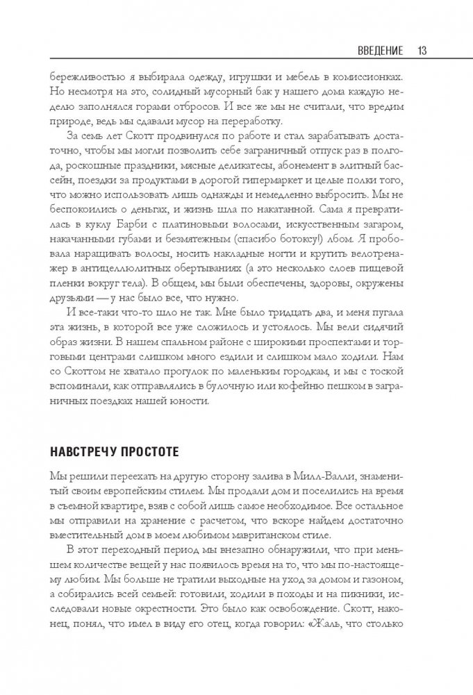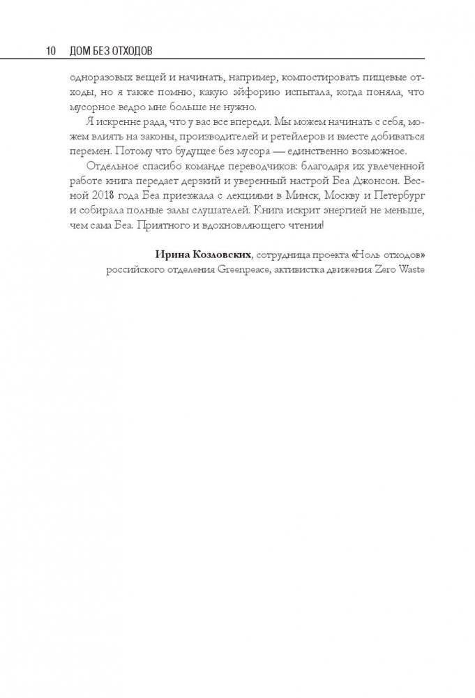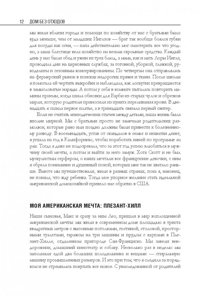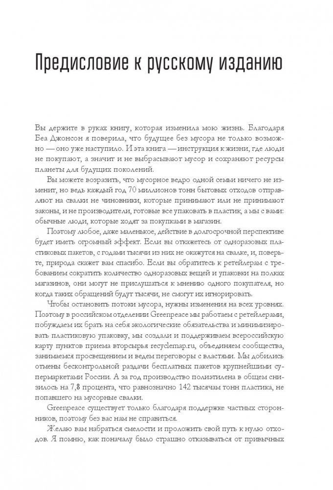 Беа Джонсон — активистка движения «ноль отходов» (Zero Waste). Ее семья из четырех человек и собаки оставляет только одну банку отходов в год и экономит до 40 процентов бюджета. В этой книге автор делится своим опытом и подробно описывает, как организовать быт в соответствии с правилом пяти «О»: отказаться от ненужного; ограничить необходимое; опять использовать уже приобретенное; отдавать на переработку то, что не можете использовать; отправлять в компост остальное. Это правило поможет вам сберечь природные ресурсы, расхламить пространство, избавиться от власти ненужных вещей, упростить быт и освободить время для действительно важных дел.