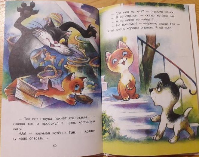 В книгу Григория Остера "Котёнок по имени Гав" вошли все истории о приключениях любознательного котёнка с необычным именем и его друга — щенка Шарика. Гав постоянно попадает в нелепые ситуации и находит приключения сразу, как только выходит из дома. Он не боится неприятностей, знает, где середина у сосиски, может объяснить для чего нужен секретный язык и почему бояться грозы веселей вместе с другом. Сказочные истории повествуют о настоящей дружбе и учат проявлять заботу по отношению к окружающим. Художники Б. Акулиничев, В. Сутеев, Т. Черкасова, Л. Шварцман. Для младшего школьного возраста.