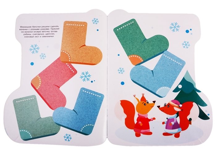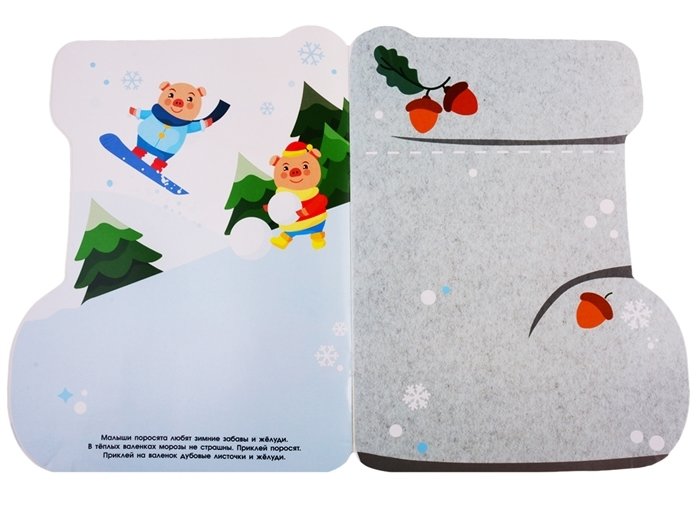 В этой книжке так много Валенок! Украшай их разными узорами и приклеивай весёлых зверюшек. Скоро Новый год! Не забудь про валенки Дедушки Мороза и Снегурочки.