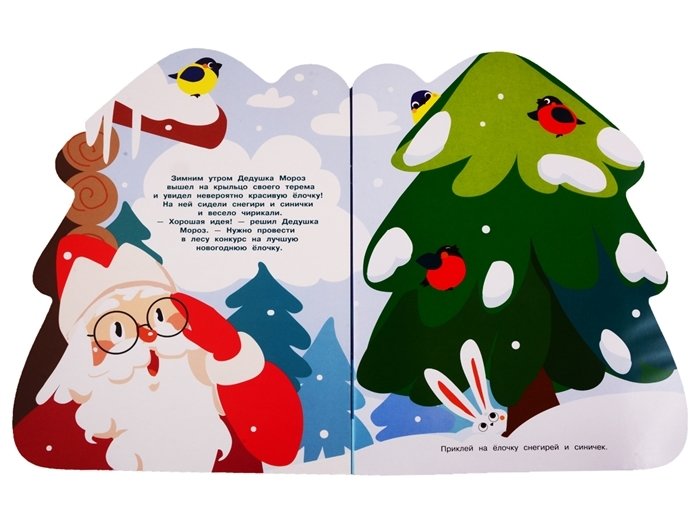 Зимним утром Дедушка Мороз вышел на крыльцо своего терема и увидел невероятно красивую ёлочку! На ней сидели снегири и синички и весело чирикали.