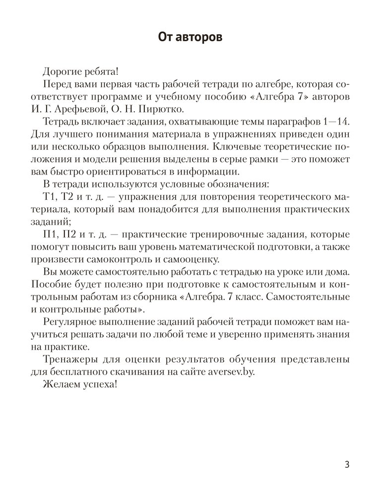 Содержание рабочей тетради соответствует программе и учебному пособию по алгебре авторов И. Г. Арефьевой, О. Н. Пирютко. В издании собраны тренировочные упражнения, которые помогут учащимся усвоить новый материал и закрепить изученное, а также приобрести уверенность в решении задач.