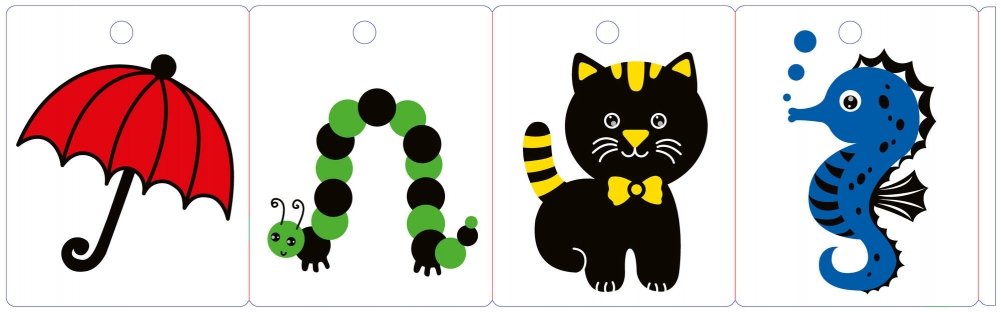 Книжка-раскладушка «Развиваем зрение от 0 до 6 месяцев» – это набор из 8 двусторонних картинок, которые раскладываются гармошкой. С одной стороны вы найдёте 8 чёрно-белых изображений, а с другой – 8 иллюстраций с использованием четырёх основных цветов.