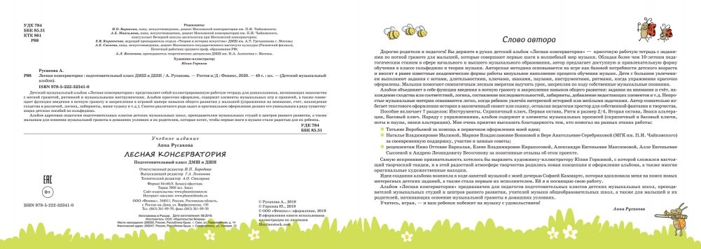 Детский музыкальный альбом "Лесная консерватория" представляет собой иллюстрированную рабочую тетрадь для дошкольников, начинающих знакомство с нотной грамотой, ритмикой и музыкальными инструментами. Альбом красочно оформлен, содержит элементы музыкальных игр и прописей, а также совмещает функции введения в нотную грамоту и закрепления в игровой манере навыков общего развития у малышей (упражнения на внимание, счет, нахождение сходства и различий, логика, лабиринты, мини-судоку и т.д.). Синтез различного рода задач и оригинальное оформление делают его уникальным в ряду существующих детских пособий по сольфеджио.