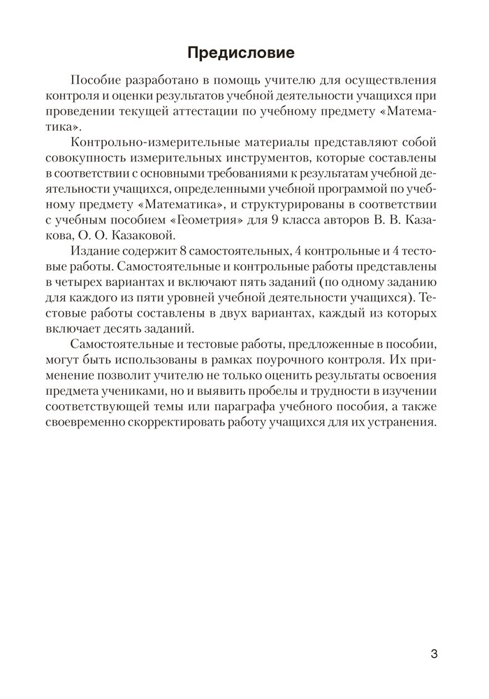 В пособии предложены контрольно-измирительные материалы, содержание которых отвечает требованиям действующей учебной программы, структуре учебного пособия «Геометрия для 9 класса» (автор В. В. Казаков, О. О. Казакова).