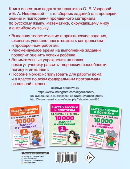 Книга известных педагогов-практиков О.Е. Узоровой и Е.А. Нефёдовой "10000 заданий и упражнений. 2 класс. Русский язык. Математика. Окружающий мир. Английский язык" — это сборник заданий для проверки знаний и повторения пройденного материала по предметам "Русский язык", "Математика", "Окружающий мир" и "Английский язык". Выполняя задания и решая примеры, ученик закрепит знания, полученные в процессе обучения. Занимательные упражнения на полях книги помогут школьнику потренировать интеллект и логику, развить творческие способности. Пособие можно использовать для работы дома и в классе по всем федеральным программам начальной школы. Для начального образования.