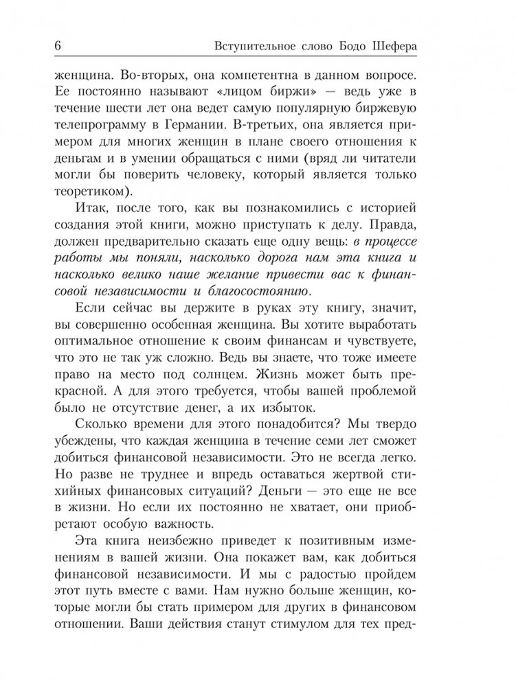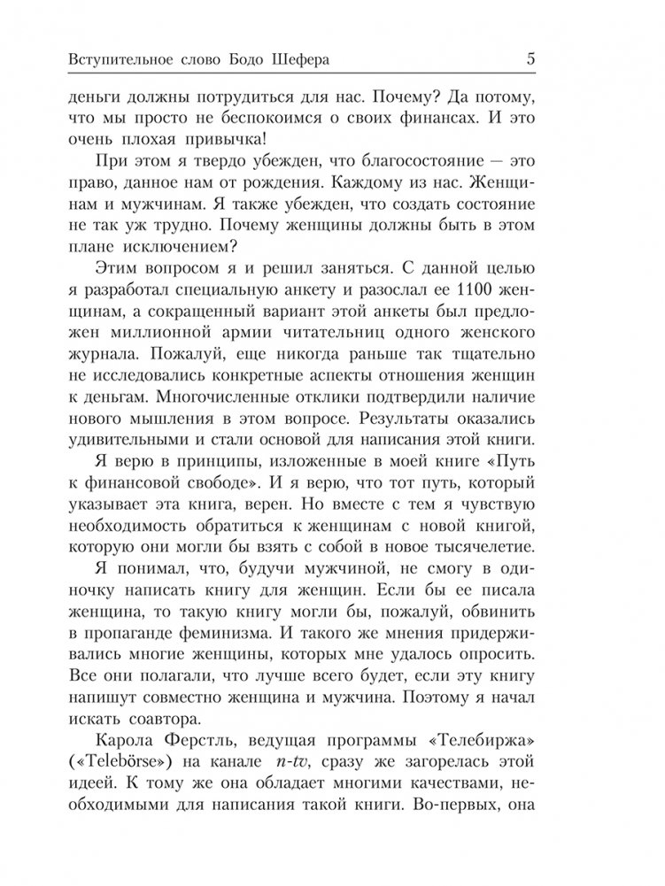 Современные женщины давно ждали эту книгу. Ведь до сих пор в своих финансовых делах они целиком полагались на мужчин или вообще не уделяли деньгам должного внимания. Теперь с этим покончено! Пришло время вашей финансовой независимости! Бодо Шефер и Карола Ферстль наглядно демонстрируют всем представительницам прекрасного пола, насколько легко и успешно они могут справиться с ролью своего личного “министра финансов”.