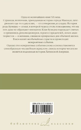 История рода Буэндиа - семьи, в которой чудеса столь повседневны, что на них даже не обращают внимания. Клан Буэндиа порождает святых и грешников, революционеров, героев и предателей, лихих авантюристов - и женщин, слишком прекрасных для обычной жизни. В нем кипят необычайные страсти - и происходят невероятные события.
