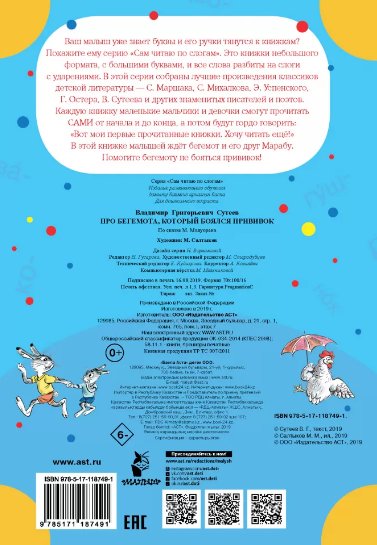 Ваш малыш уже знает буквы и его ручки тянутся к книжкам? Покажите ему серию "Сам читаю по слогам". Это книжки небольшого формата, с большими буквами, и все слова разбиты на слоги с ударениями. В этой серии собраны лучшие произведения классиков детской литературы — С. Маршака, С. Михалкова, Э. Успенского, Г. Остера, В. Сутеева и других знаменитых писателей и поэтов. Каждую книжку маленькие мальчики и девочки смогут прочитать САМИ от начала и до конца, а потом будут гордо говорить: "Вот мои первые прочитанные книжки. Хочу читать ещё!" В этой книжке малышей ждёт бегемот и его друг Марабу. Помогите бегемоту не бояться прививок!