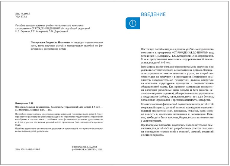 В пособии представлены комплексы оздоровительной гимнастики для детей 4–5 лет. Приводятся разнообразные игровые задания и игры малой подвижности. Упражнения подобраны в соответствии с особенностями физического развития дошкольников 4–5 лет, с учетом специфики условий места проведения (зал, площадка) и времени года.