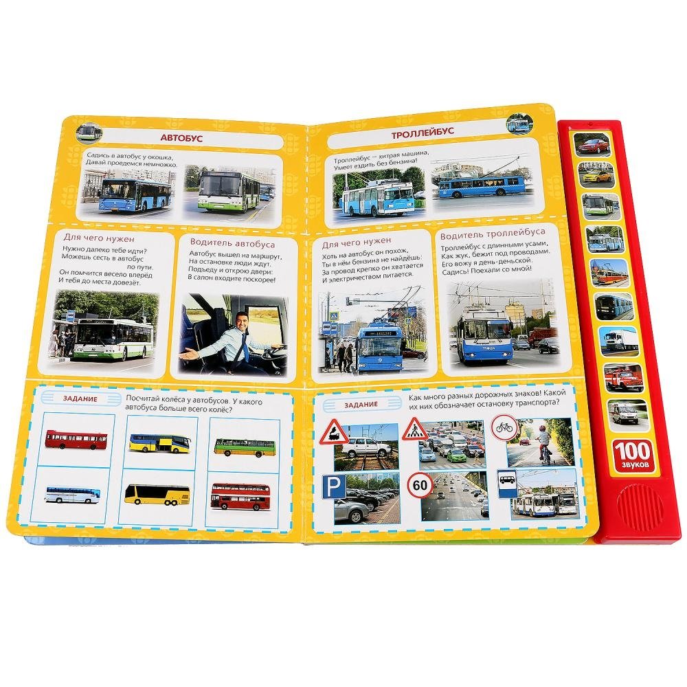 - книжка с "изюминкой" сразу привлечёт внимание: 10 звуковых кнопок на обложке при нажатии порадуют вас и ребёнка 100 звуками машин!