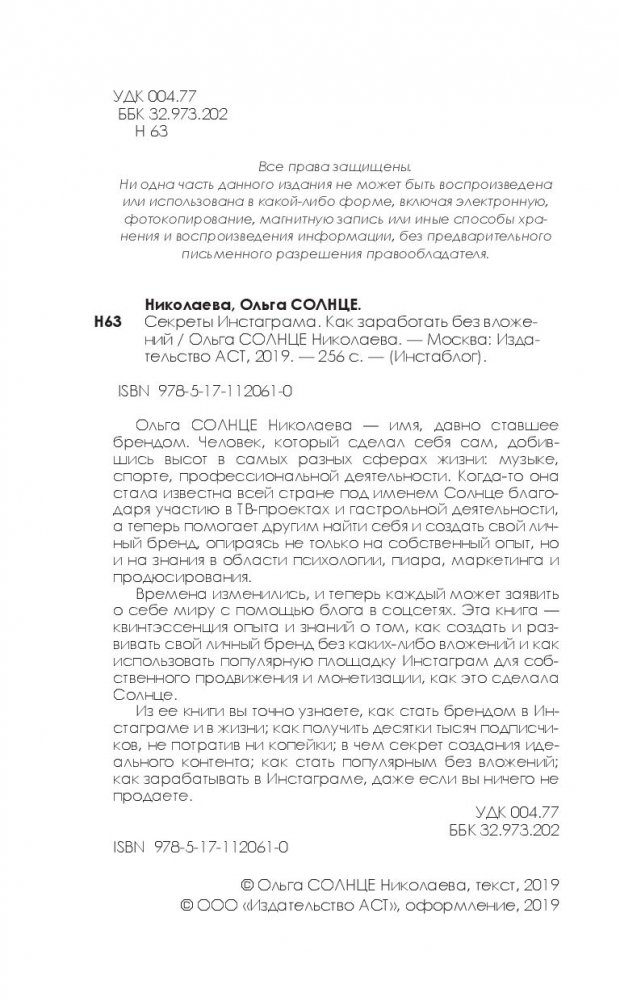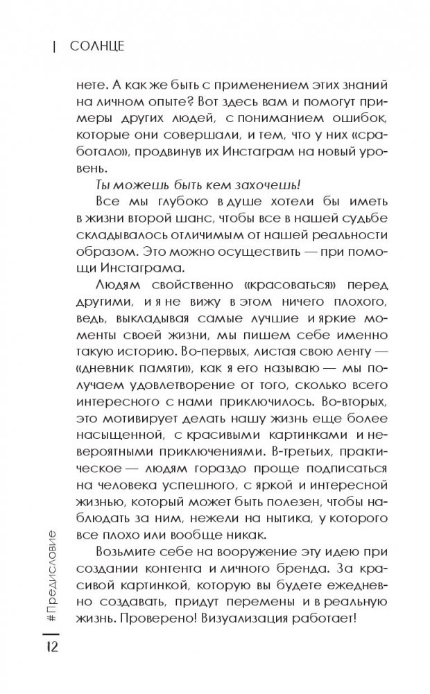 Времена изменились, и теперь каждый может заявить о себе миру с помощью блога в соцсетях. Эта книга — квинтэссенция опыта и знаний о том, как создать и развивать свой личный бренд без каких-либо вложений и как использовать популярную площадку Инстаграм для собственного продвижения и монетизации, как это сделала Солнце.