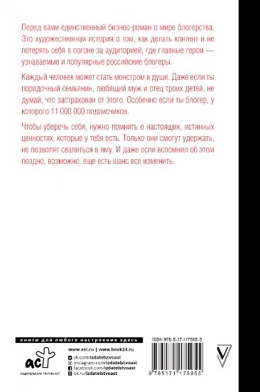 Перед вами единственный бизнес-роман о мире блогерства. Это художественная история о том, как делать контент и не потерять себя в погоне за аудиторией, где главные герои — узнаваемые и популярные российские блогеры.