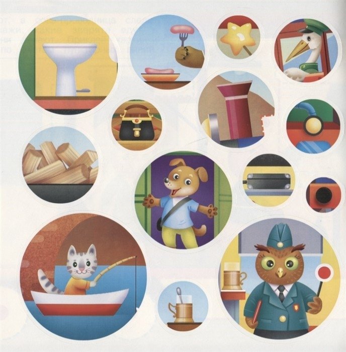 Внутри книжки лист с наклейками, с их помощью можно дополнить каждую картинку деталями, предметами или персонажами -надо только проявить фантазию.