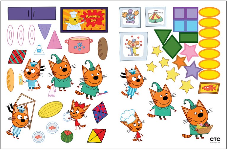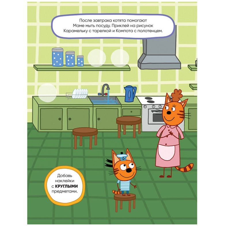 Миу-миу-миу! А ваш ребенок любит мультсериал «Три кота»? Тогда ему обязательно понравится эта красочная книжка с многоразовыми наклейками, рассказывающая об одном дне из жизни Компота, Коржика и Карамельки.
