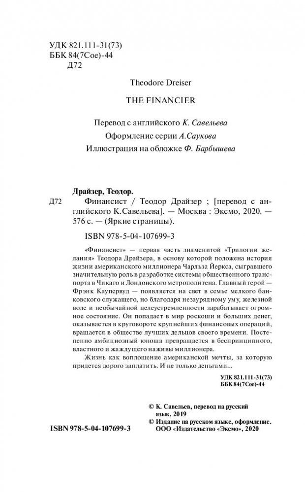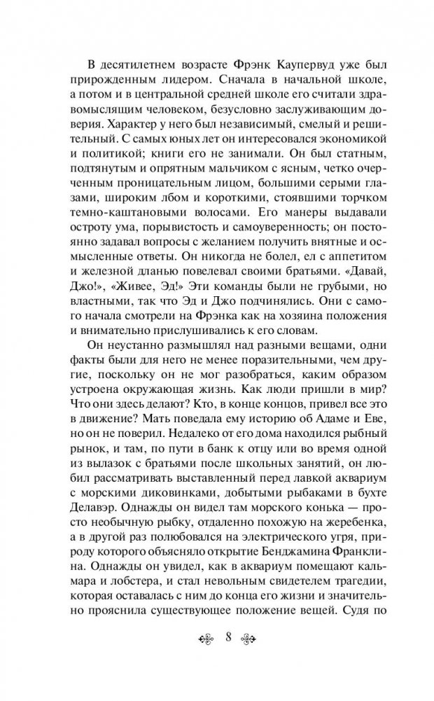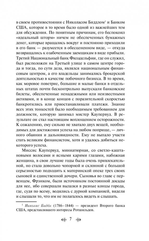"Финансист" — первая часть знаменитой "Трилогии желания" Теодора Драйзера, в основу которой положена история жизни американского миллионера Чарльза Йеркса, сыгравшего значительную роль в разработке системы общественного транспорта в Чикаго и Лондонского метрополитена. Главный герой — Фрэнк Каупервуд — появляется на свет в семье мелкого банковского служащего, но благодаря незаурядному уму, железной воле и необычайной целеустремленности зарабатывает огромное состояние. Он попадает в мир роскоши и больших денег, оказывается в круговороте крупнейших финансовых операций, вращается в обществе лучших дельцов своего времени. Постепенно амбициозный юноша превращается в беспринципного, властного и жаждущего наживы миллионера. Жизнь как воплощение американской мечты, за которую придется дорого заплатить. И не только деньгами…