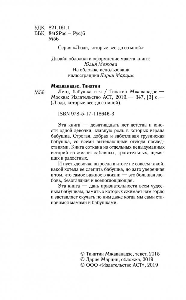 Эта книга — девятнадцать лет детства и юности одной девочки, главную роль в которых играла бабушка. Строгая, добрая и заботливая грузинская бабушка, со всеми вытекающими отсюда последствиями. Книга соткана из отдельных невыдуманных историй из жизни: забавных, трогательных, щемящих и радостных.