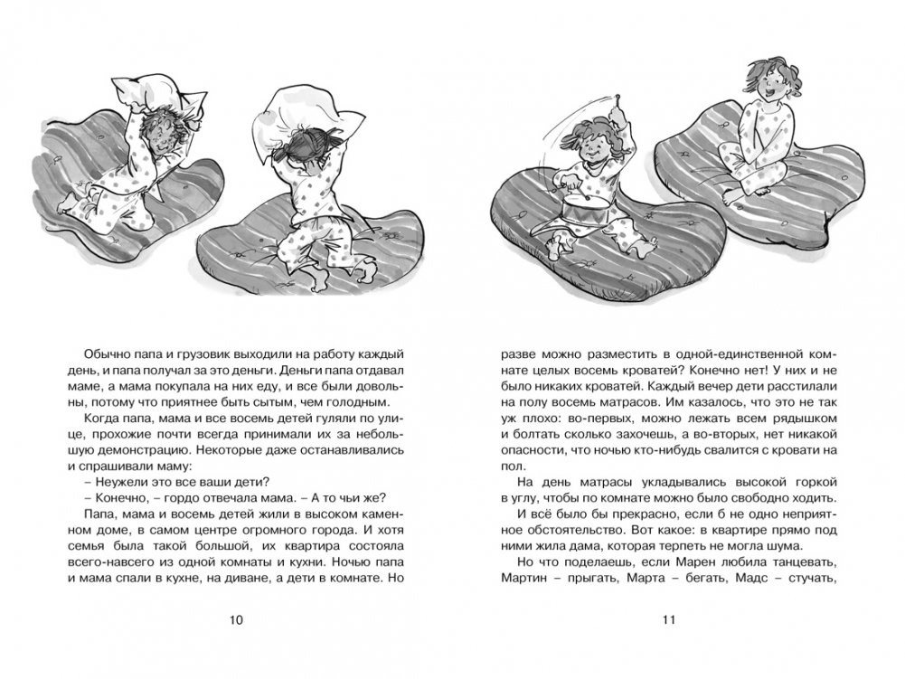 «Жила-была большая-пребольшая семья: папа, мама и целых восемь детей… И ещё с ними жил небольшой грузовик, который они все очень любили. Ещё бы не любить – ведь грузовик кормил всю семью!» Вот так писательница представляет своих героев. Она рассказывает о жизни многодетной семьи, в которой родители всегда находят общий язык с детьми. Автор не скрывает, что любит своих героев, и её любовь передаётся читателям.